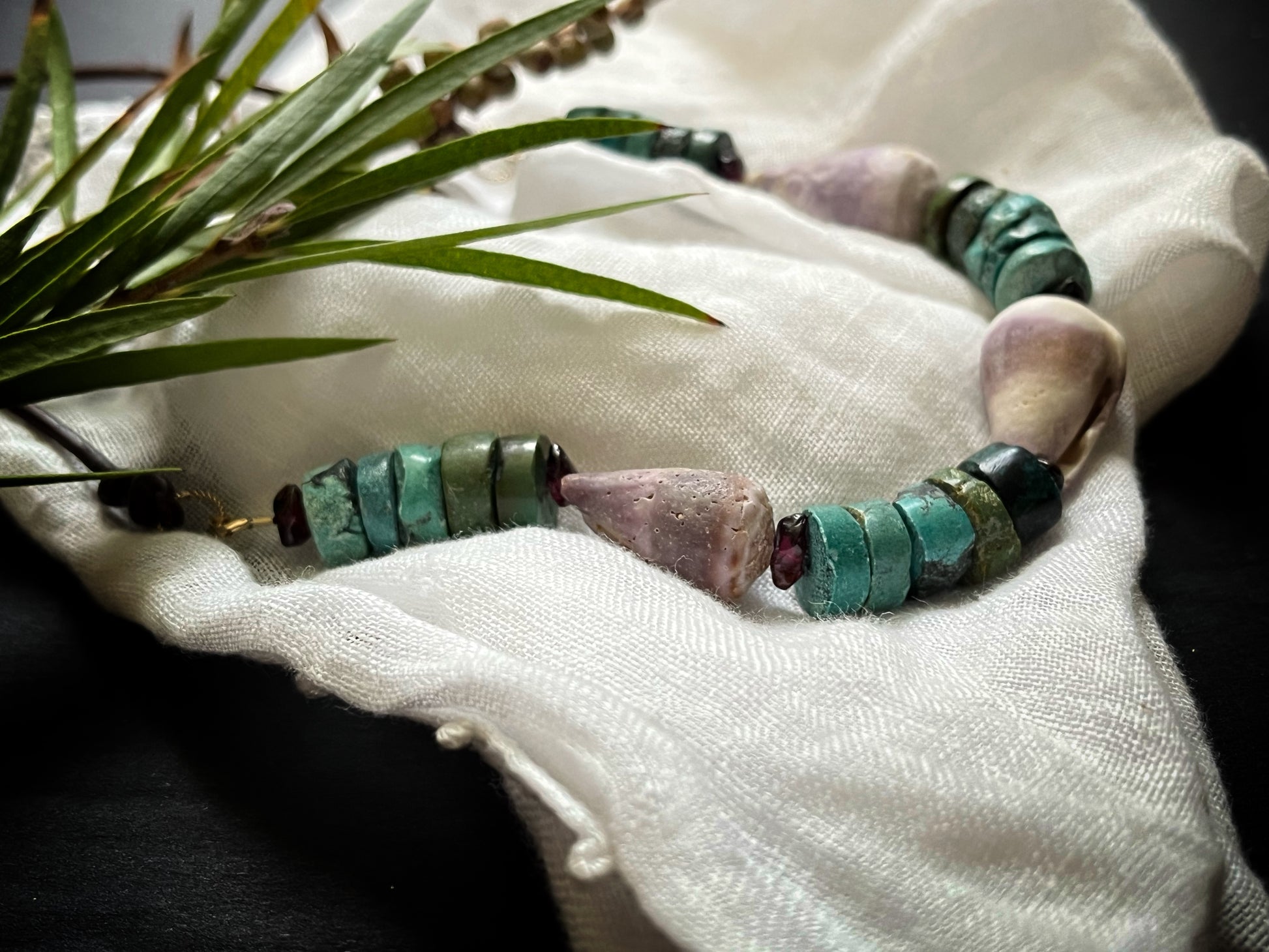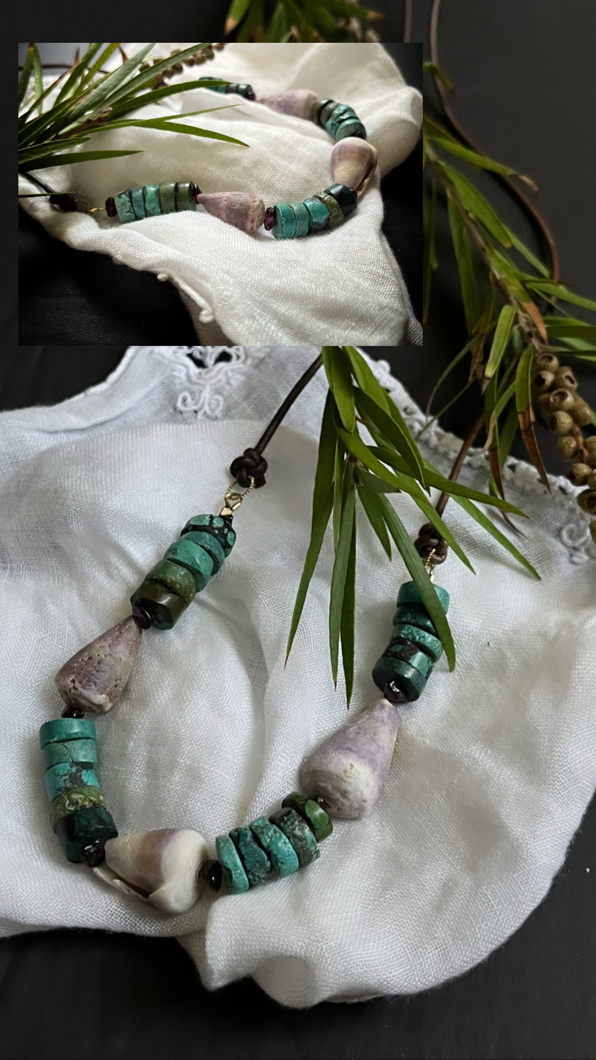 Hawaiian cone shells hand picked by kelsey in Hawaii paired with amethyst x natural turquoise finished on vintage grey Greek leather + 14k gf hardware