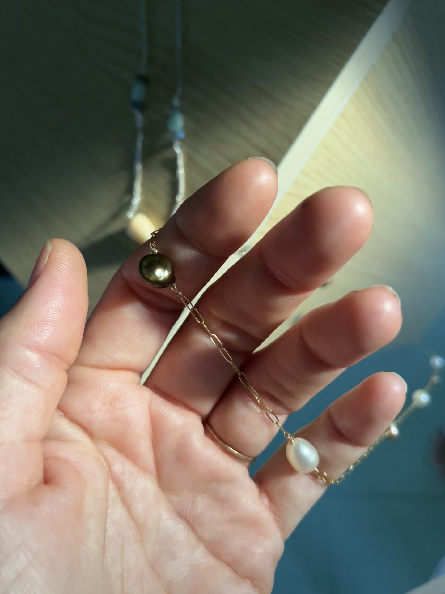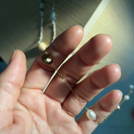 Antique grade AA+ salt water pearls x fresh Water pearls x peacock moss baroque pearl woven onto 30” 14kt gf paperclip chain