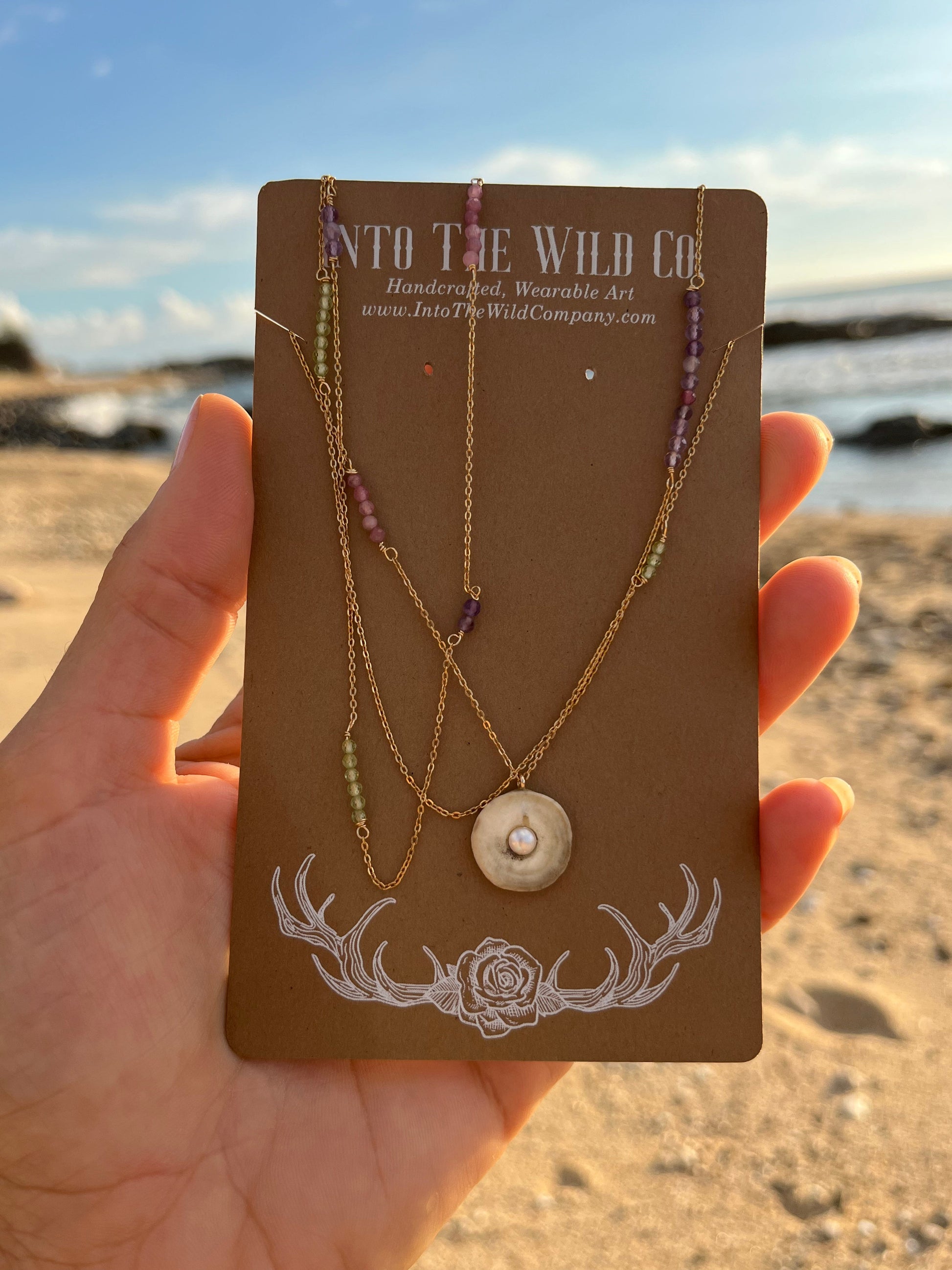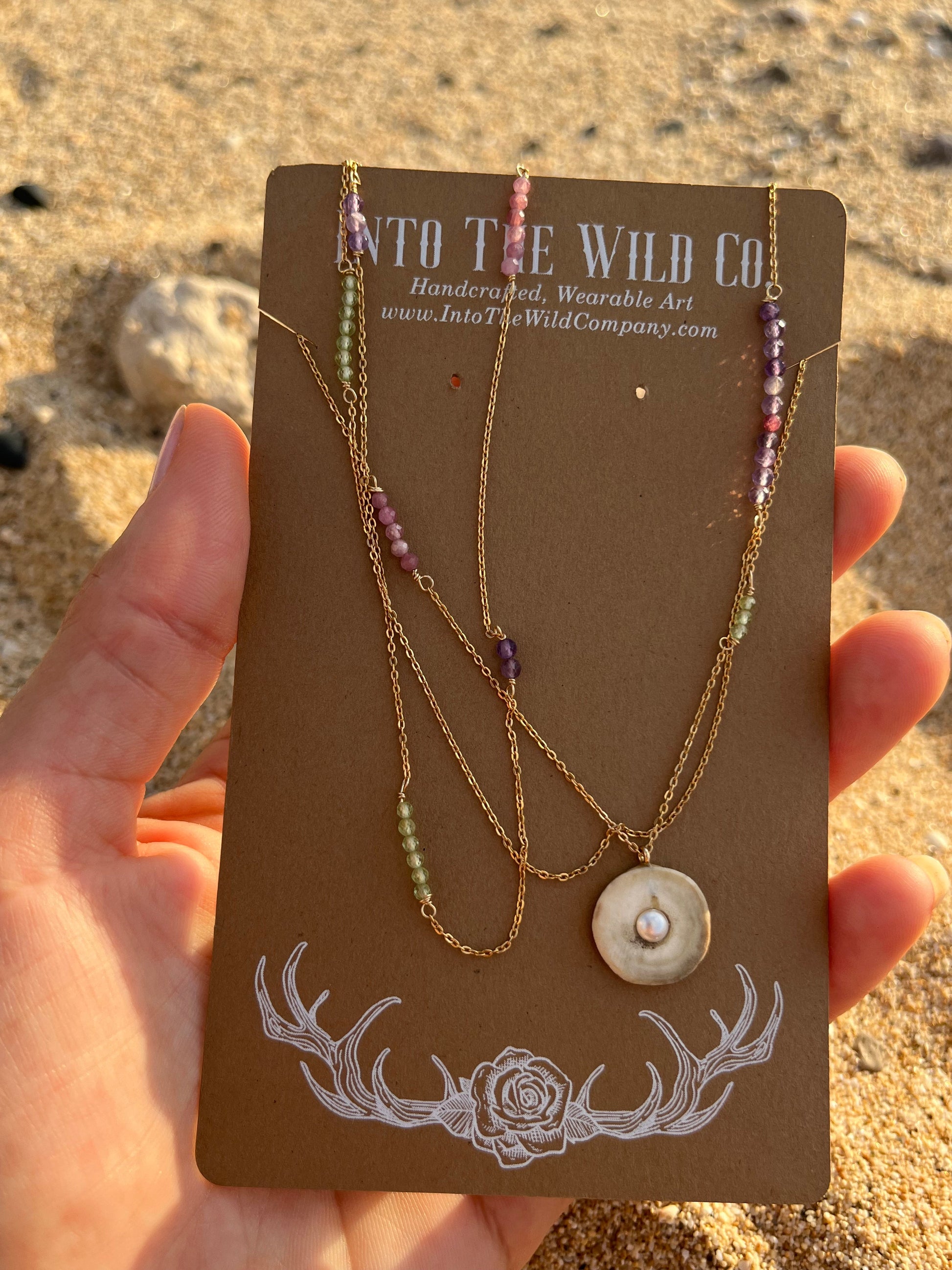 Faceted Pink tourmaline + peridot + amethyst gemstone sprinkled 14kt gold filled diamond cut cable chain with a signature Pearl inlaid antler pendant
