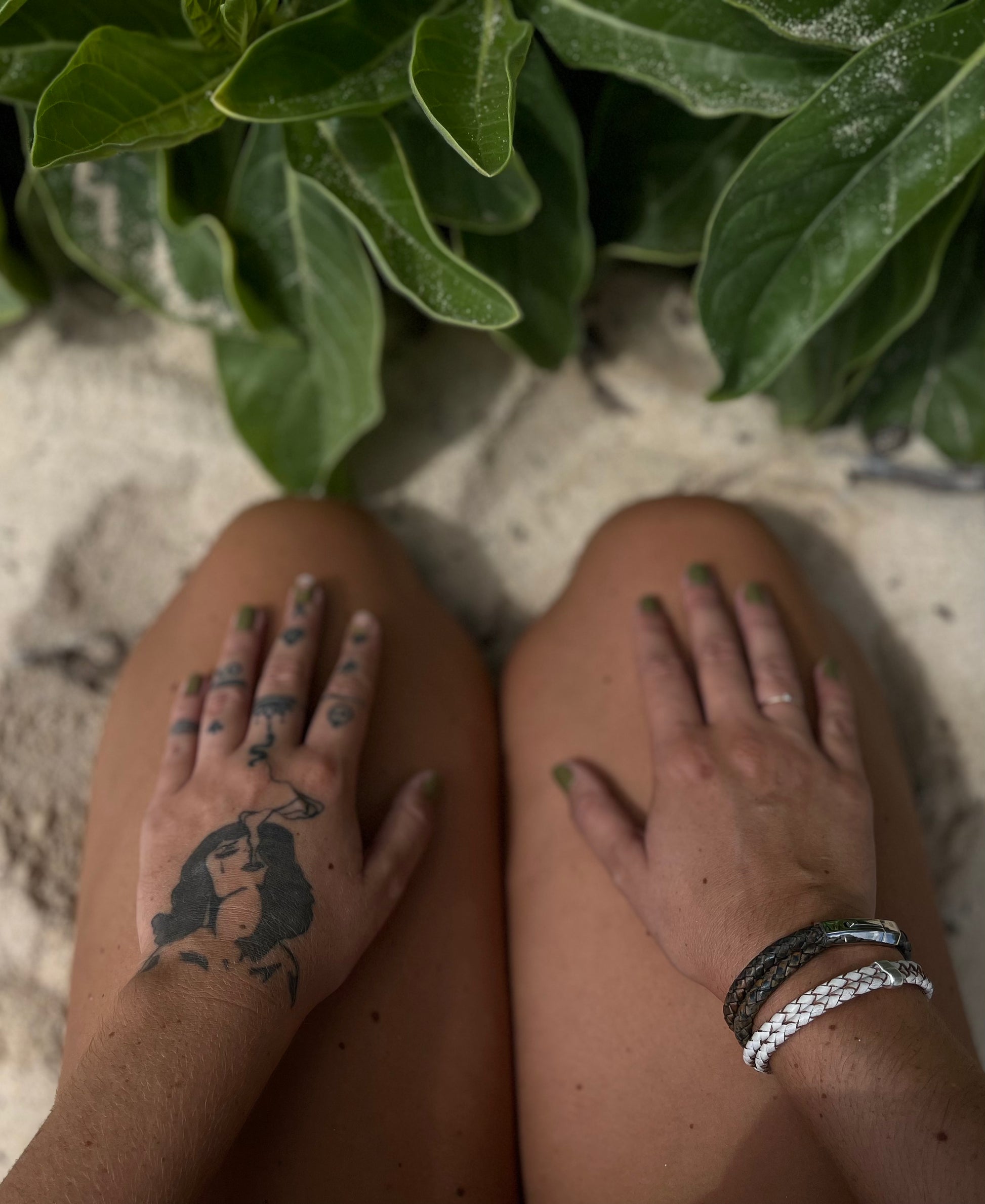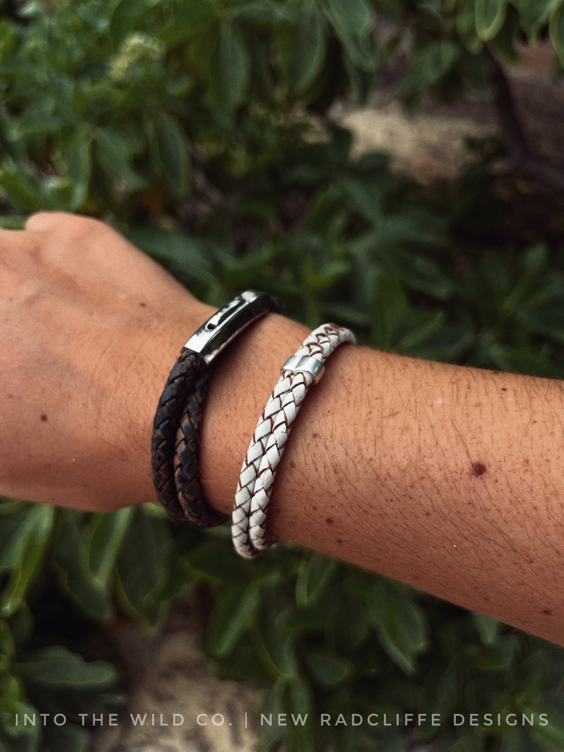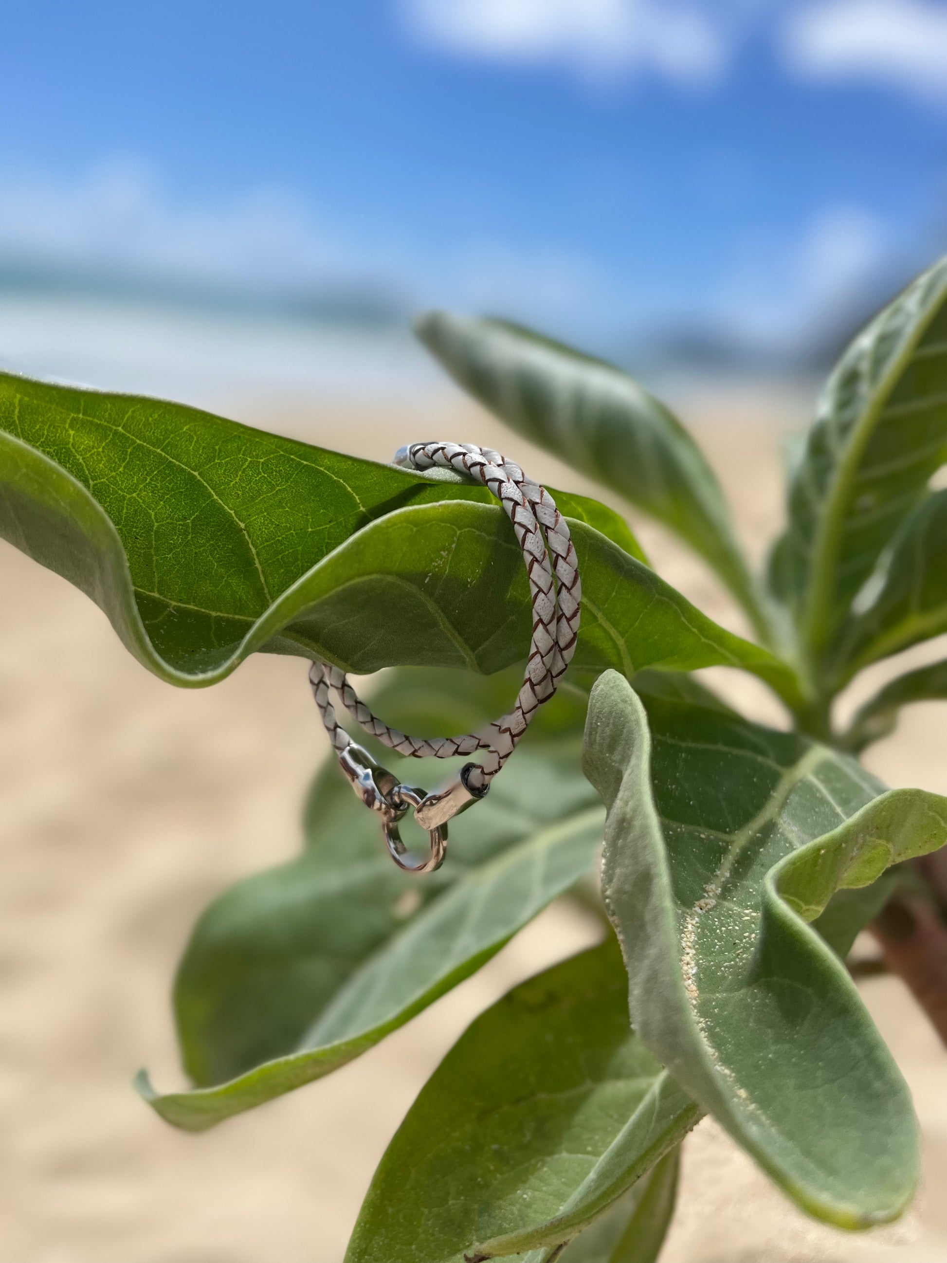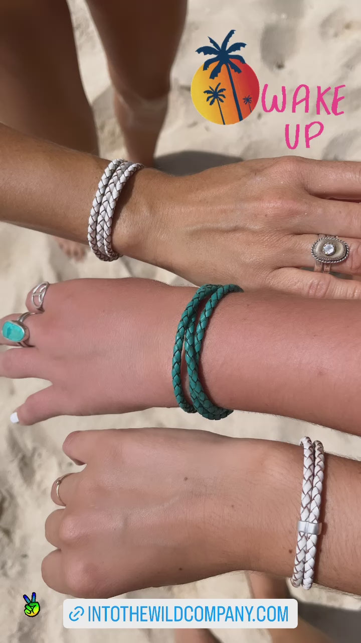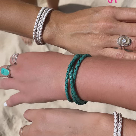 4mm Woven oxhide leather double wrapped and accented with a Sterling piece hand cast in Greece (this piece of metal holds the two bands next to each other in a more unified look) finished with my daintiest (easy to use) signature clasp