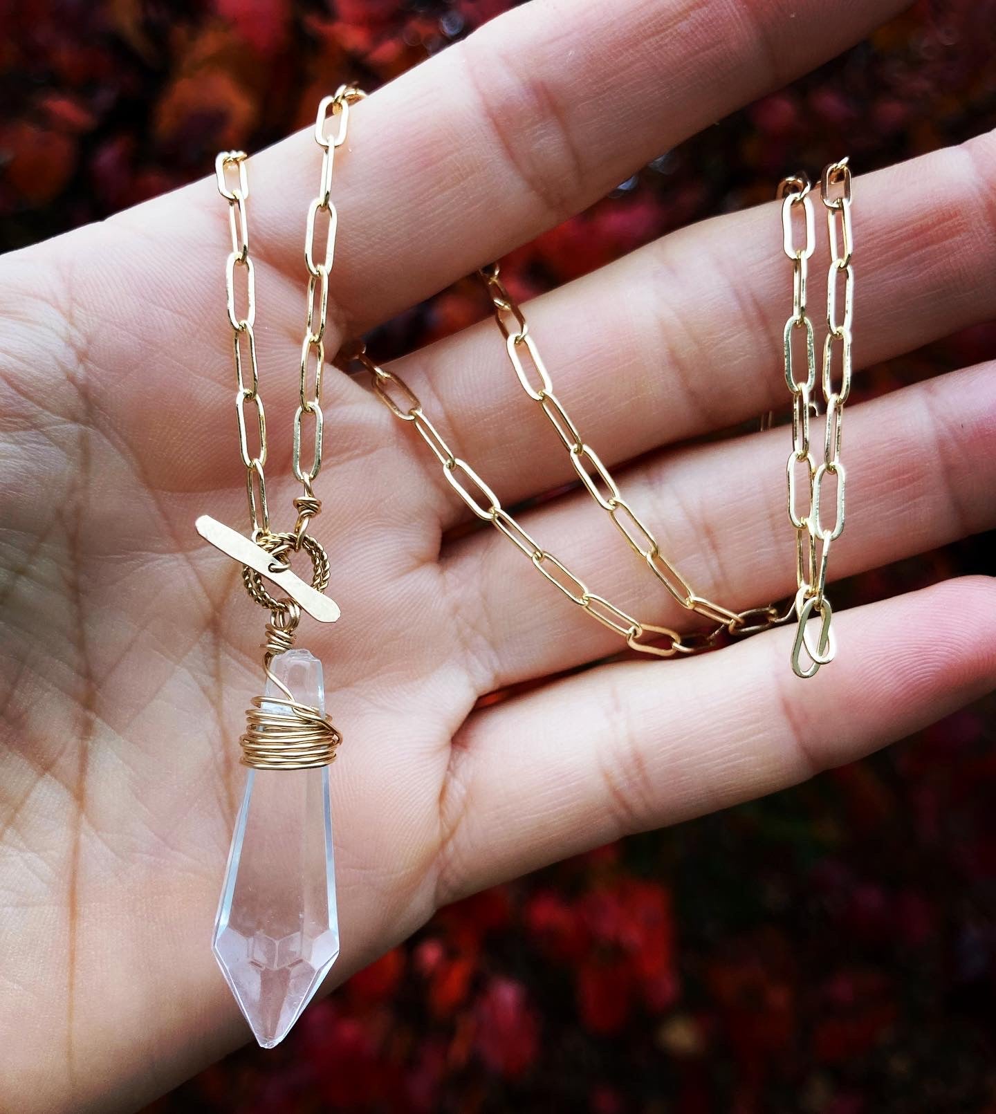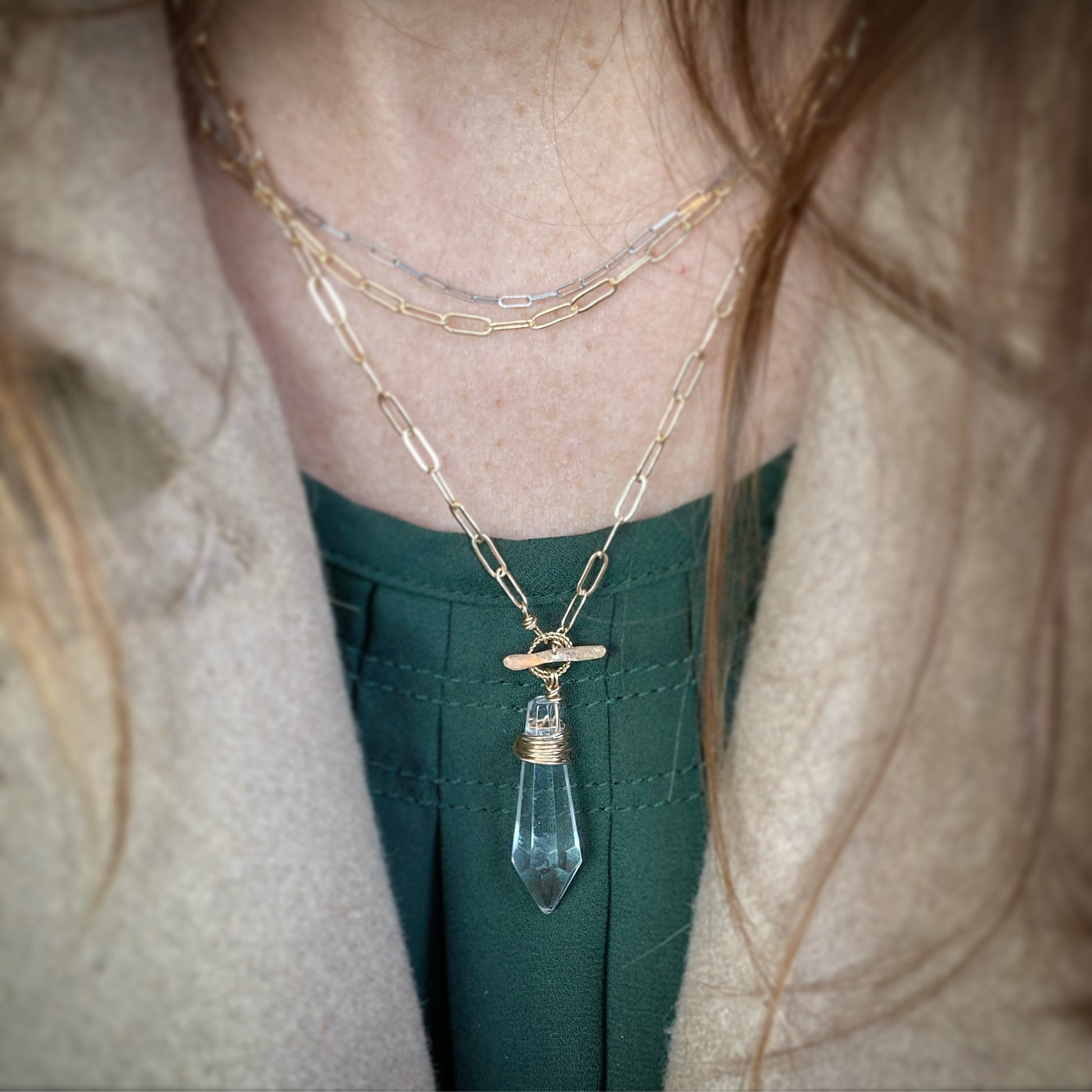 This small, antuqie chandelier crystal is from an old home in the Historic District of Beaufort, SC. The Lowcountry. It is beautifully paired with a trendy & timeless 14kt gold filled chain in a unique design featuring a hand crafted, hammered toggle clasp in front for character. The pendant drop is 1.5”