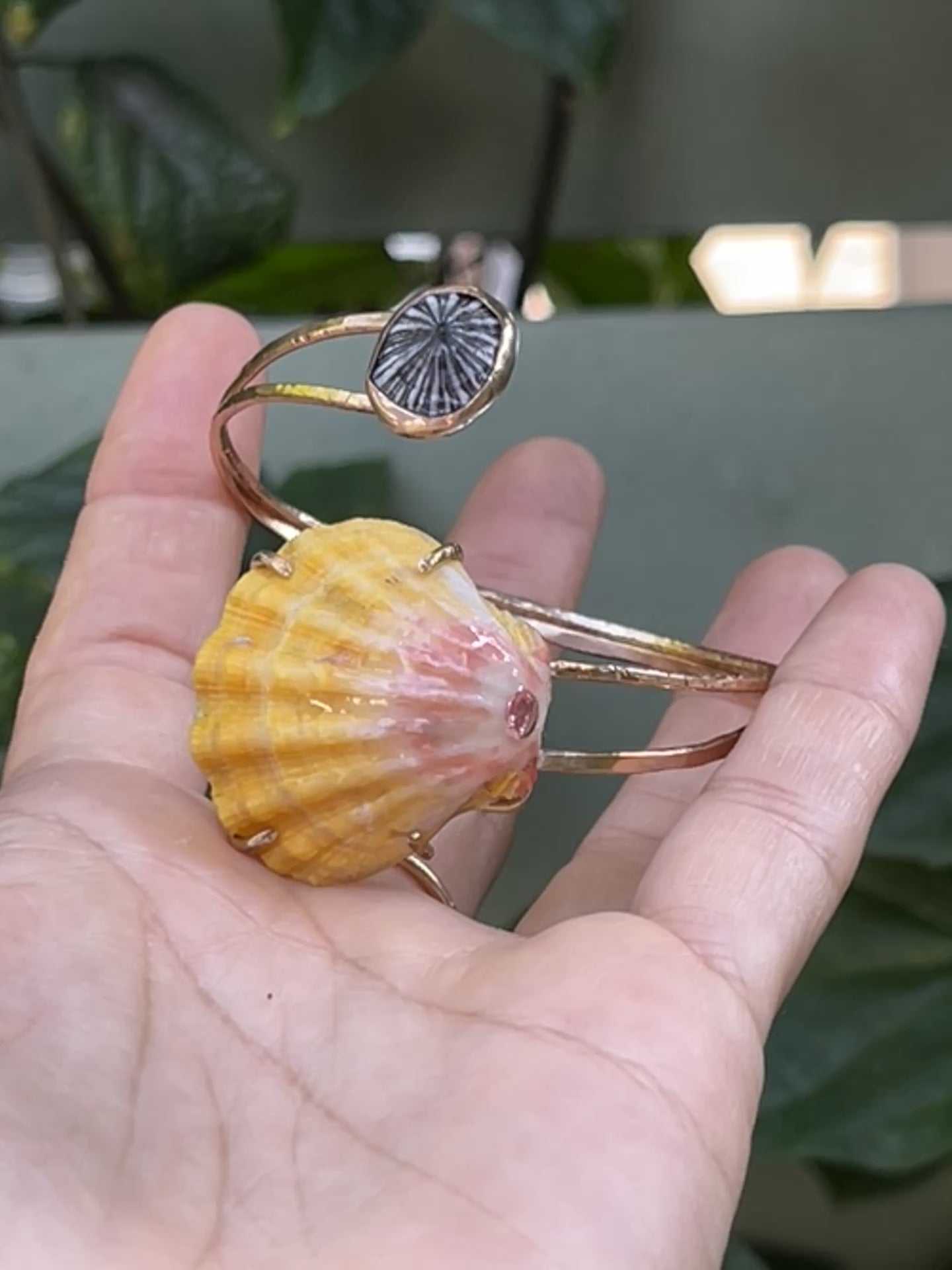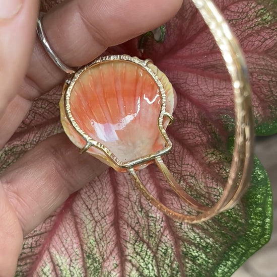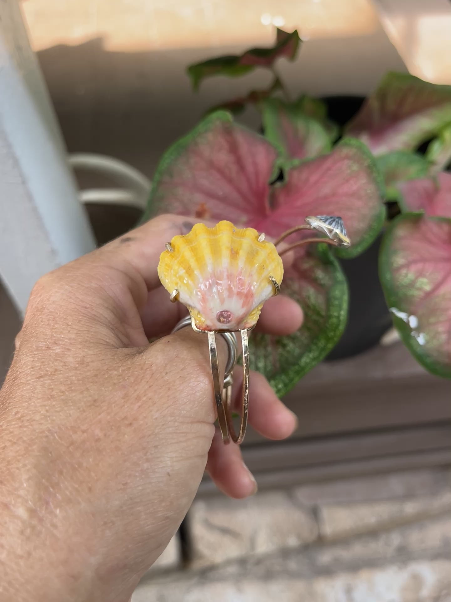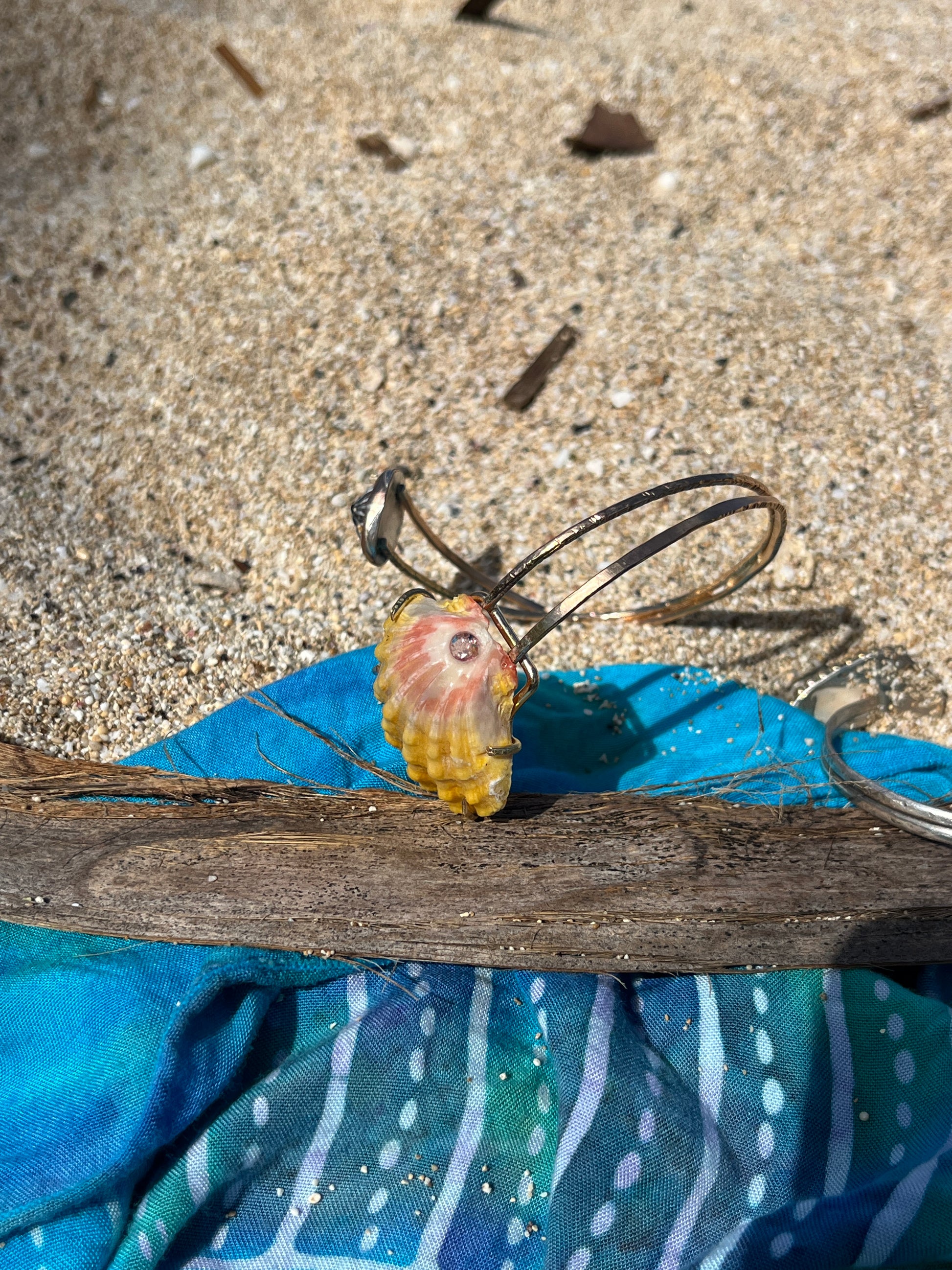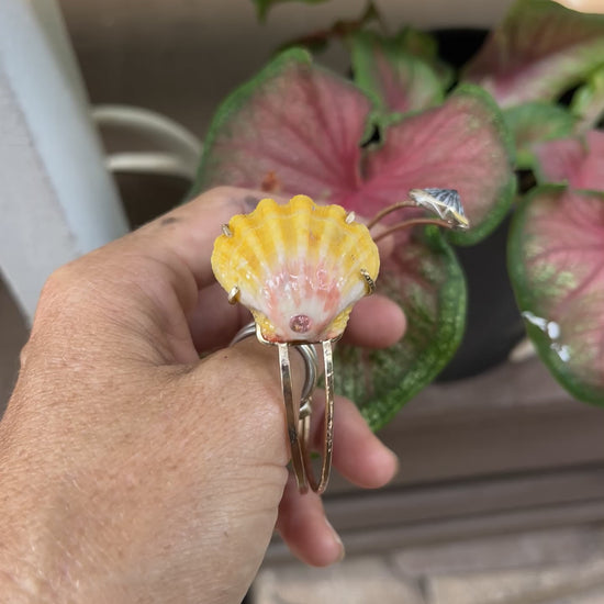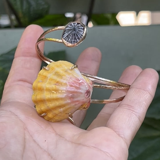 I found her on the west side of Oahu and thought she looked so stunning in the prong setting with the pink tourmaline stone. I was really stoked when I found this Sunrise Shell. It is honestly textbook; with it’s stunning, canary yellow, bumpy ridges full of character & it's soft pink hues at the base - this was the perfect candidate to inlay a princess cut piece of pink tourmaline. And the underside was just as stunning with an array of stunning pinks - so I have to prong set her! Paired with a Hawaiian limpet shell (‘Opihi Awa) & 14k gold filled bands; this is truly such a unique piece.