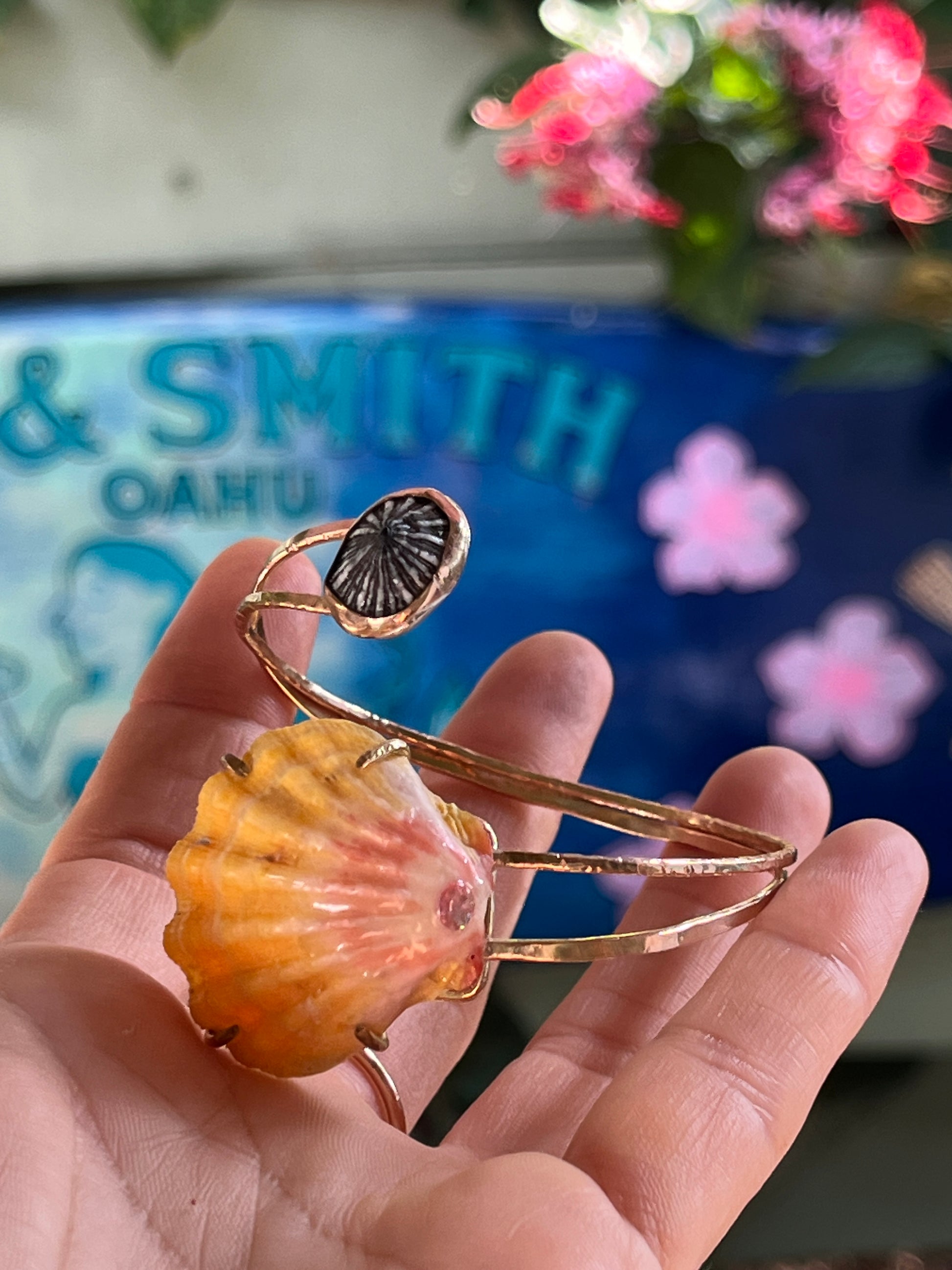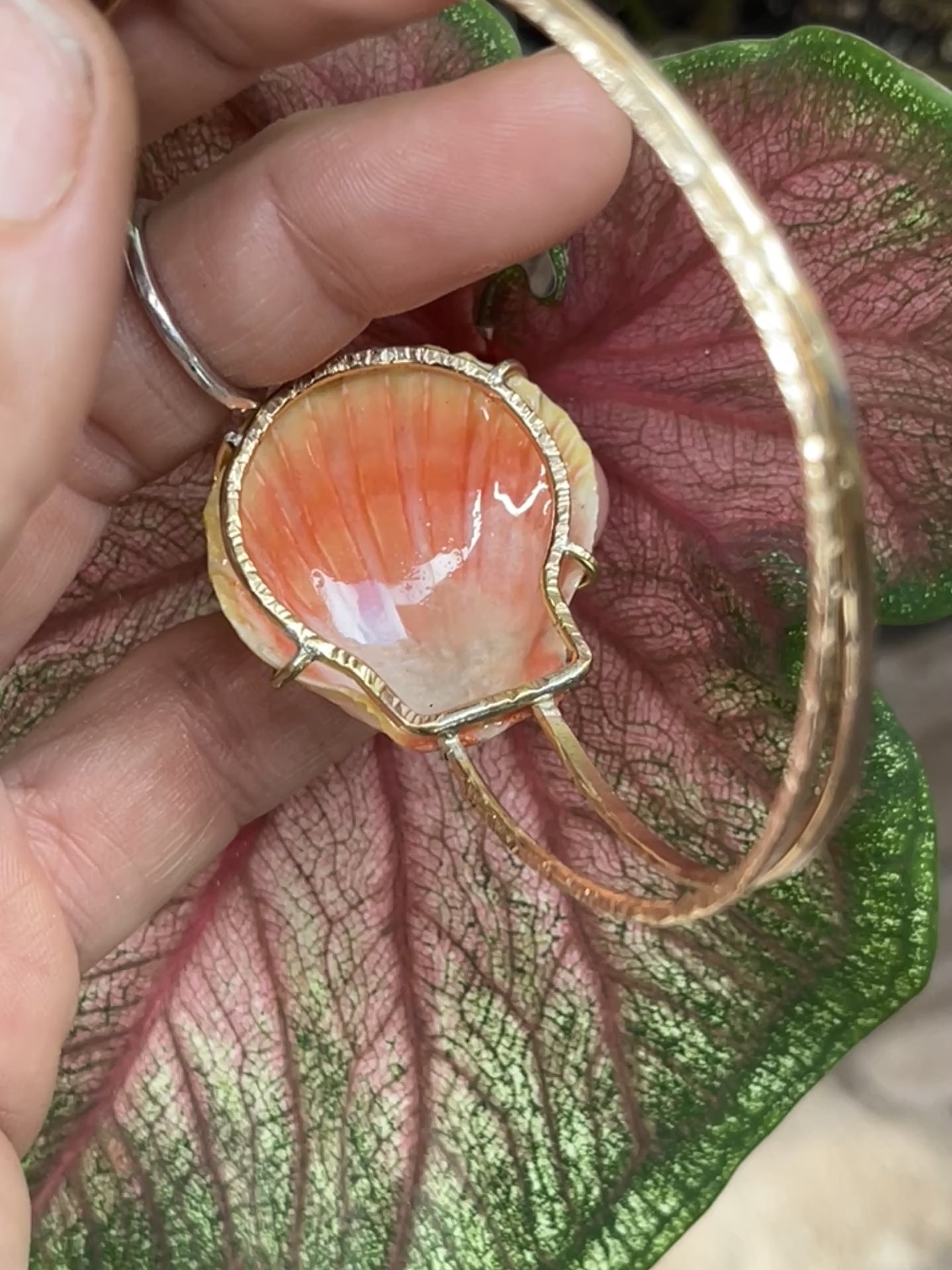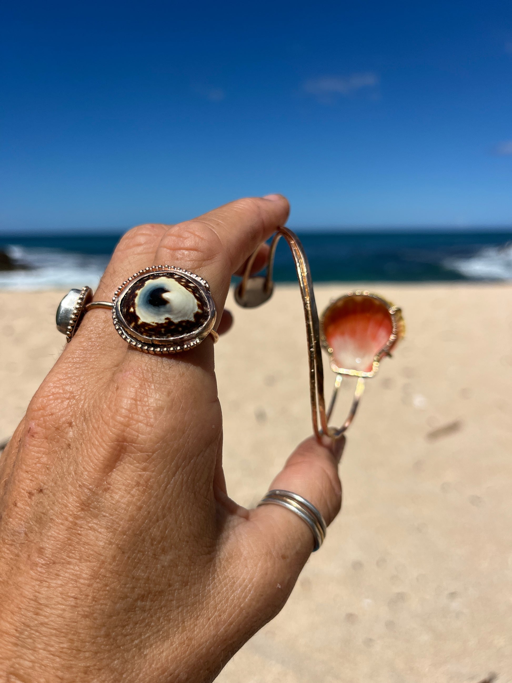 I found her on the west side of Oahu and thought she looked so stunning in the prong setting with the pink tourmaline stone. I was really stoked when I found this Sunrise Shell. It is honestly textbook; with it’s stunning, canary yellow, bumpy ridges full of character & it's soft pink hues at the base - this was the perfect candidate to inlay a princess cut piece of pink tourmaline. And the underside was just as stunning with an array of stunning pinks - so I have to prong set her! Paired with a Hawaiian limpet shell (‘Opihi Awa) & 14k gold filled bands; this is truly such a unique piece.