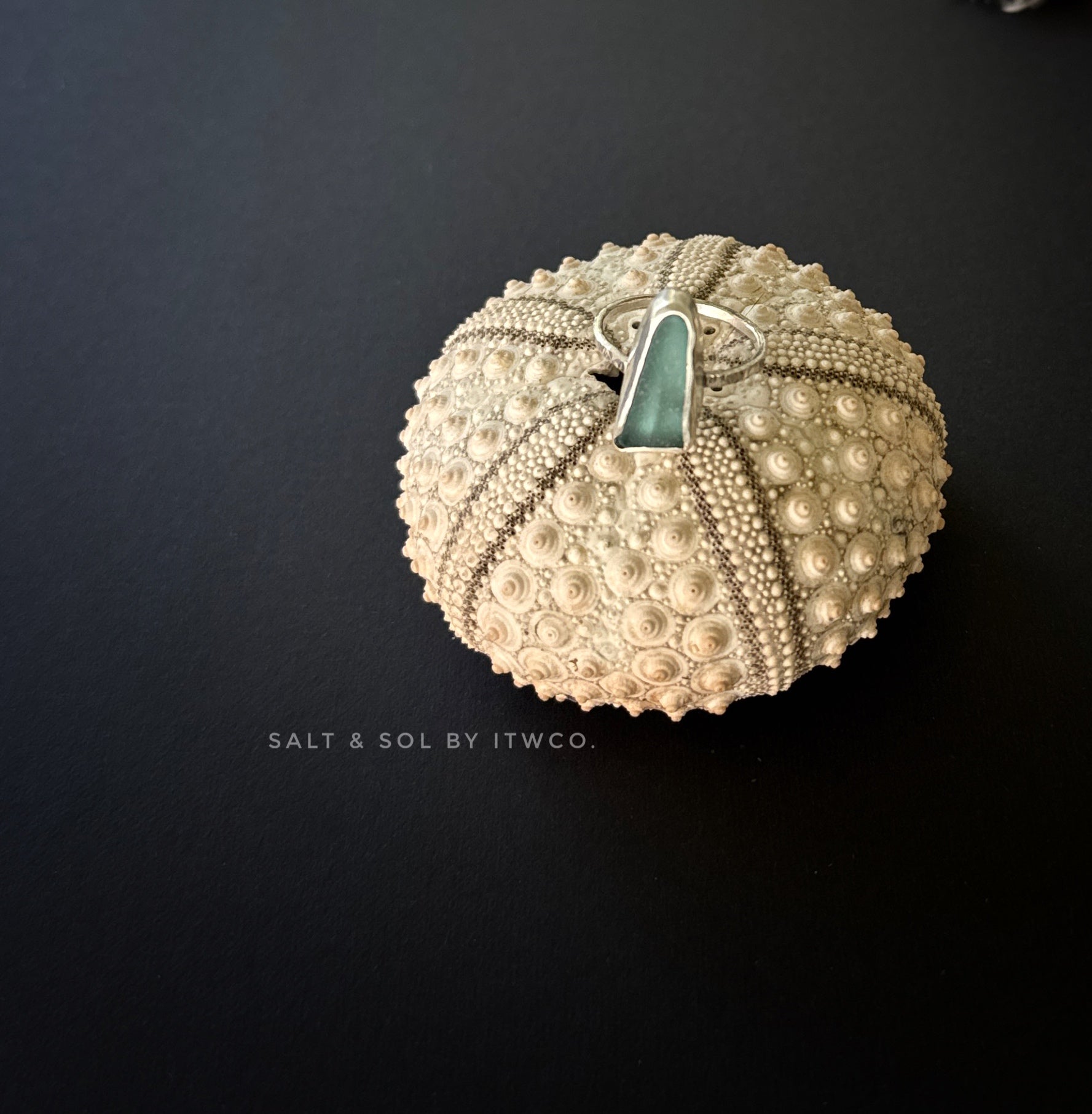 Hand picked sea glass from my families house in Nova Scotia, Canada - this light turquoise beauty is hand forged in sterling and complimented with a textured band.