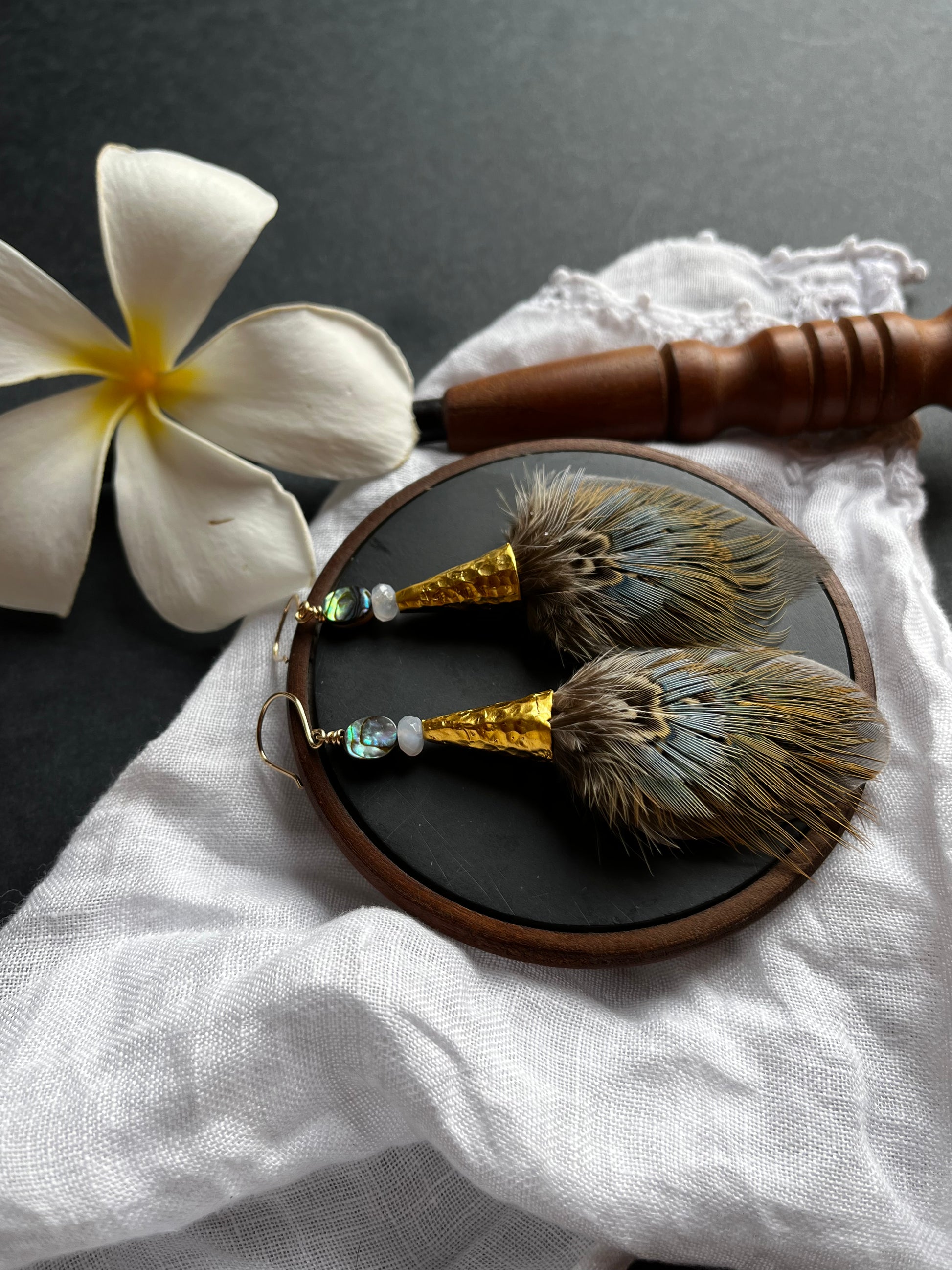 Pheasant feathers gently encased in 14kt gold filled caps accented with abalone x lace agate 🤍