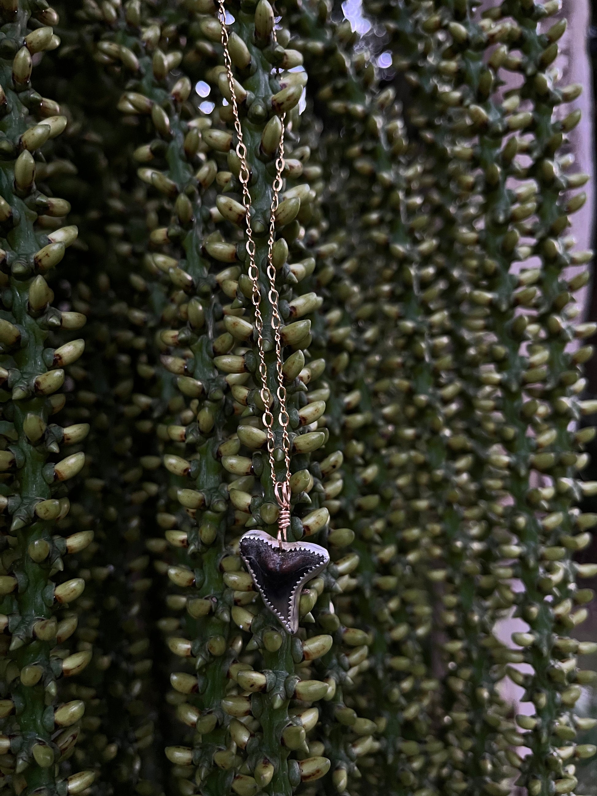 Hand picked Charleston, SC fossalized shark tooth in a handforged sterling bezel complimented with 14k gf wire wrapping on a 3mm, 16” 14k gf figure 8 chain