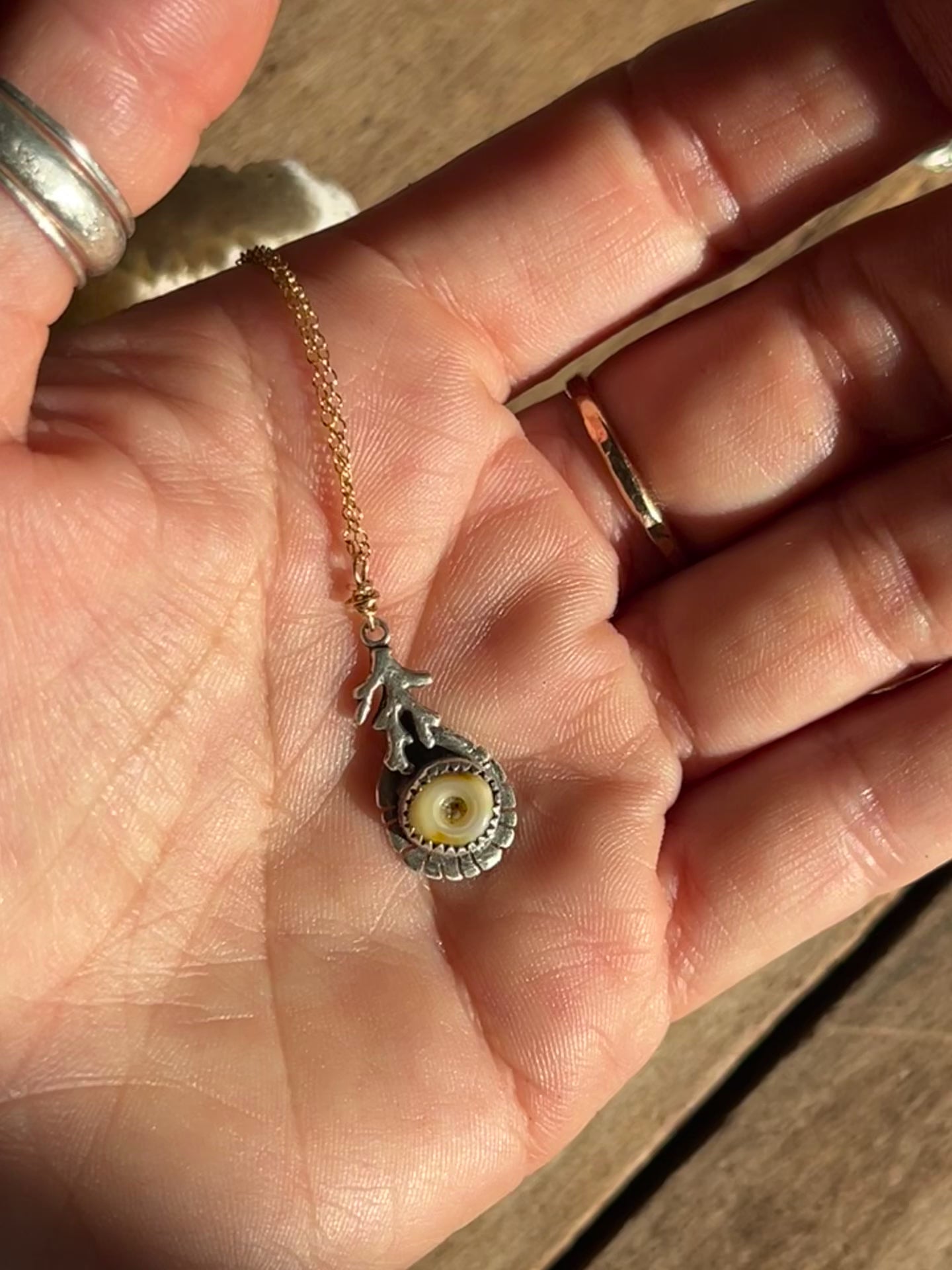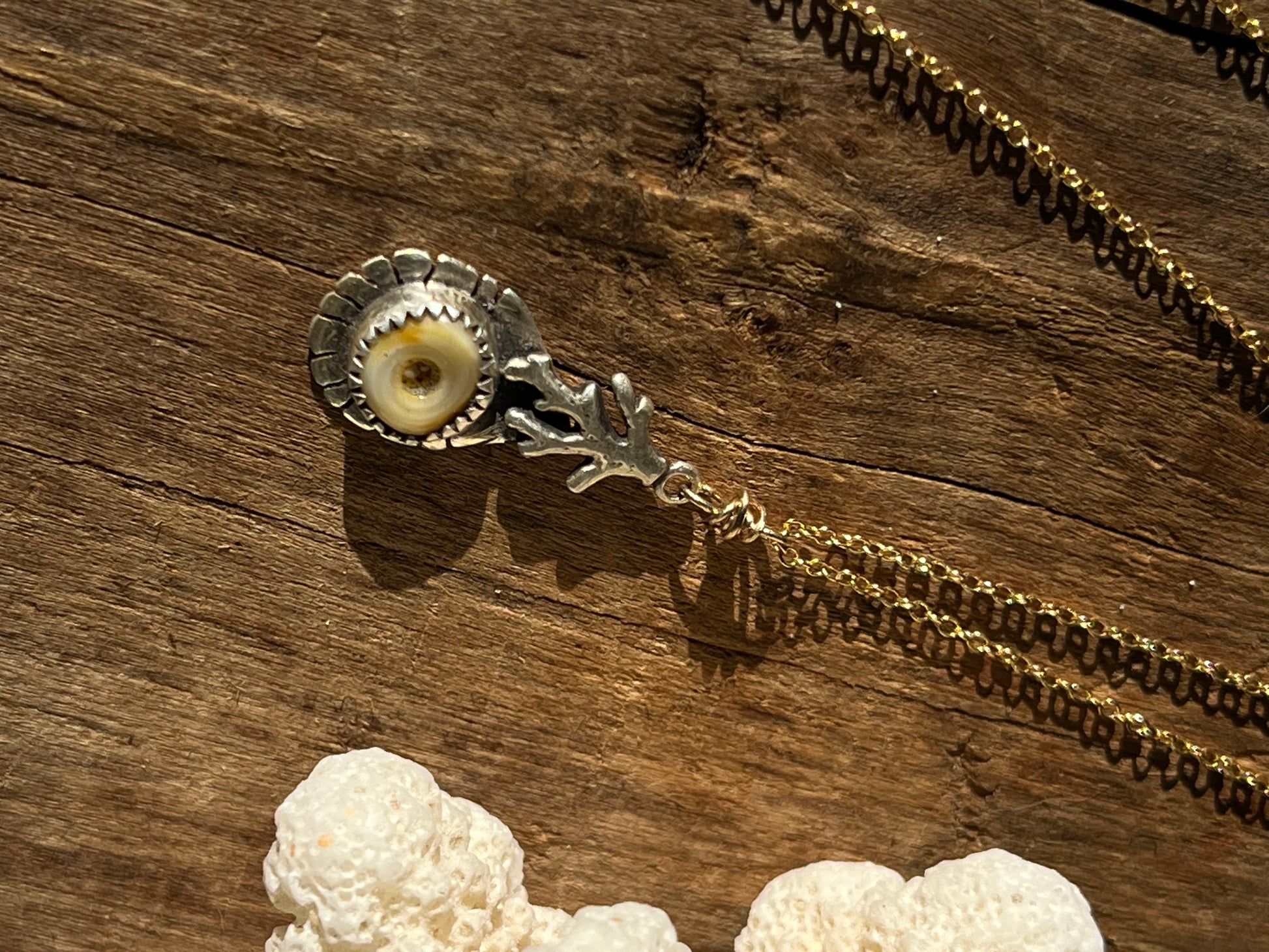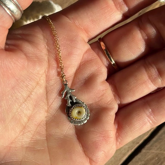 This necklace features a handpicked Hawaiian puka shell in a vibrant yellow-orange hue, complete with sediment sand inside! Set in a hand-forged bezel to represent the warmth and radiance of the aloha sunshine. Embrace the natural beauty of the islands with this organically crafted piece.