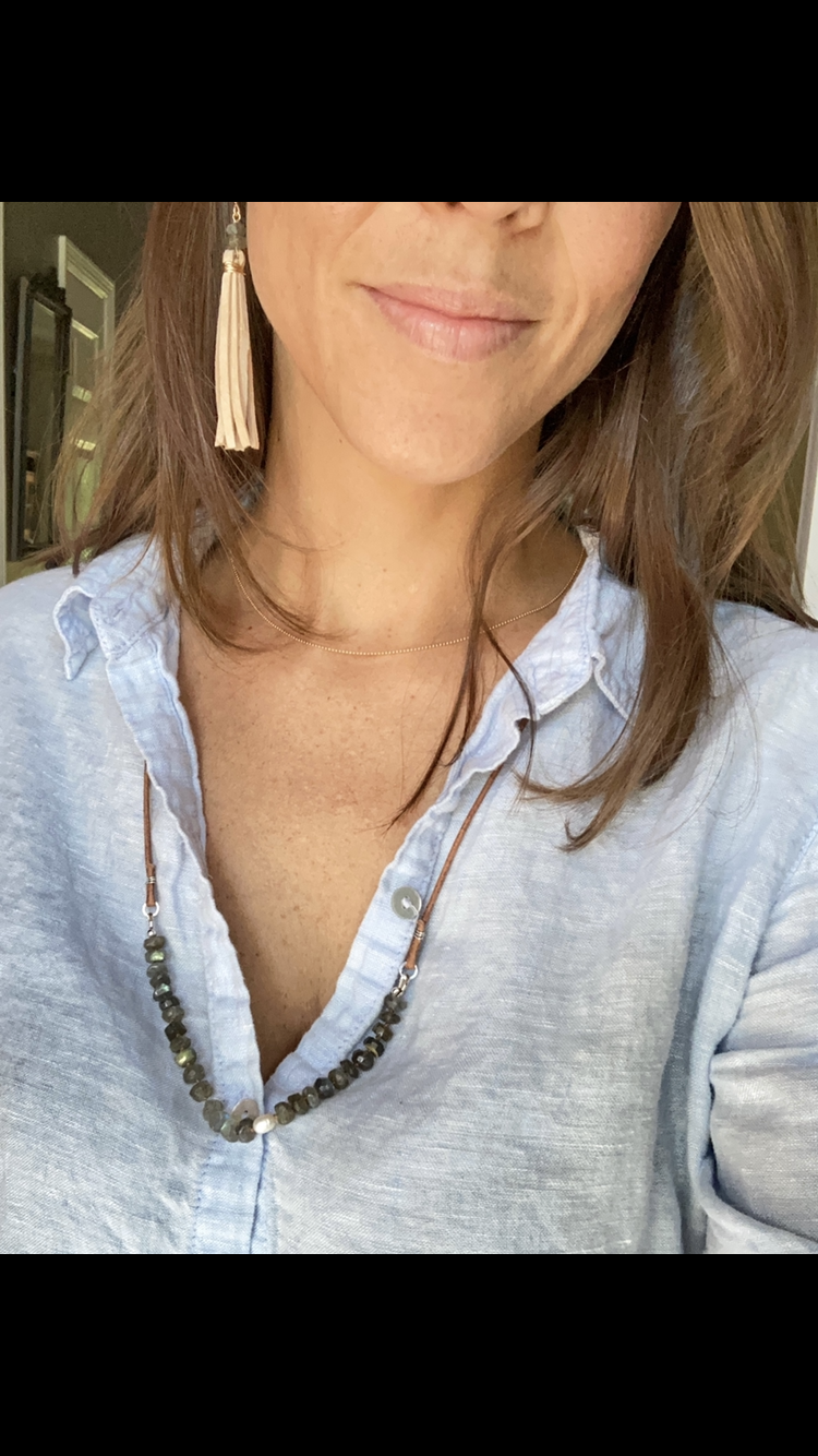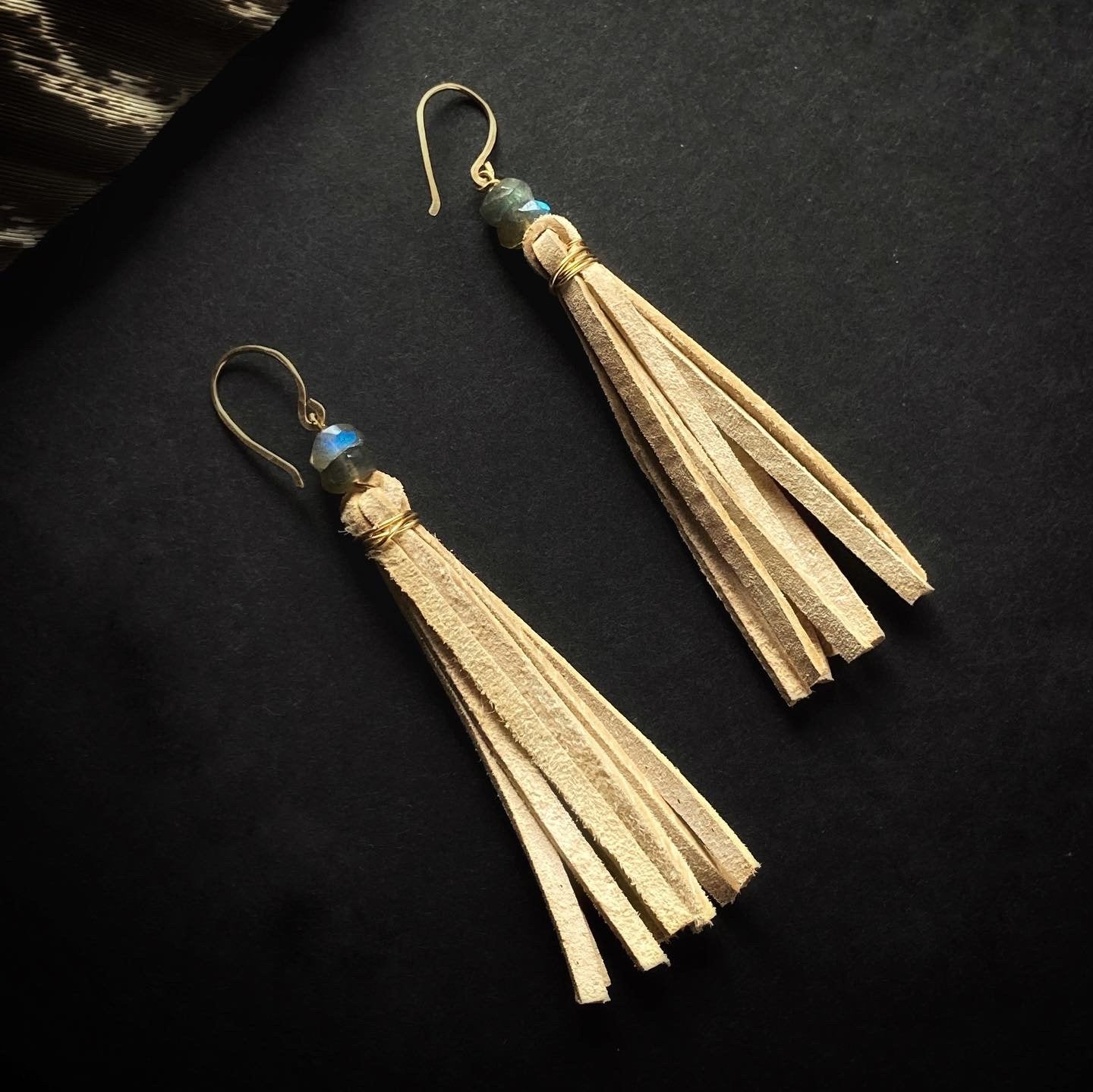 Hand-cut North American Deerskin Leather wrapped in 14kt gold filled wire paired with labradorite stones finished with hammered 14kt gold filled ear wire