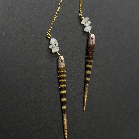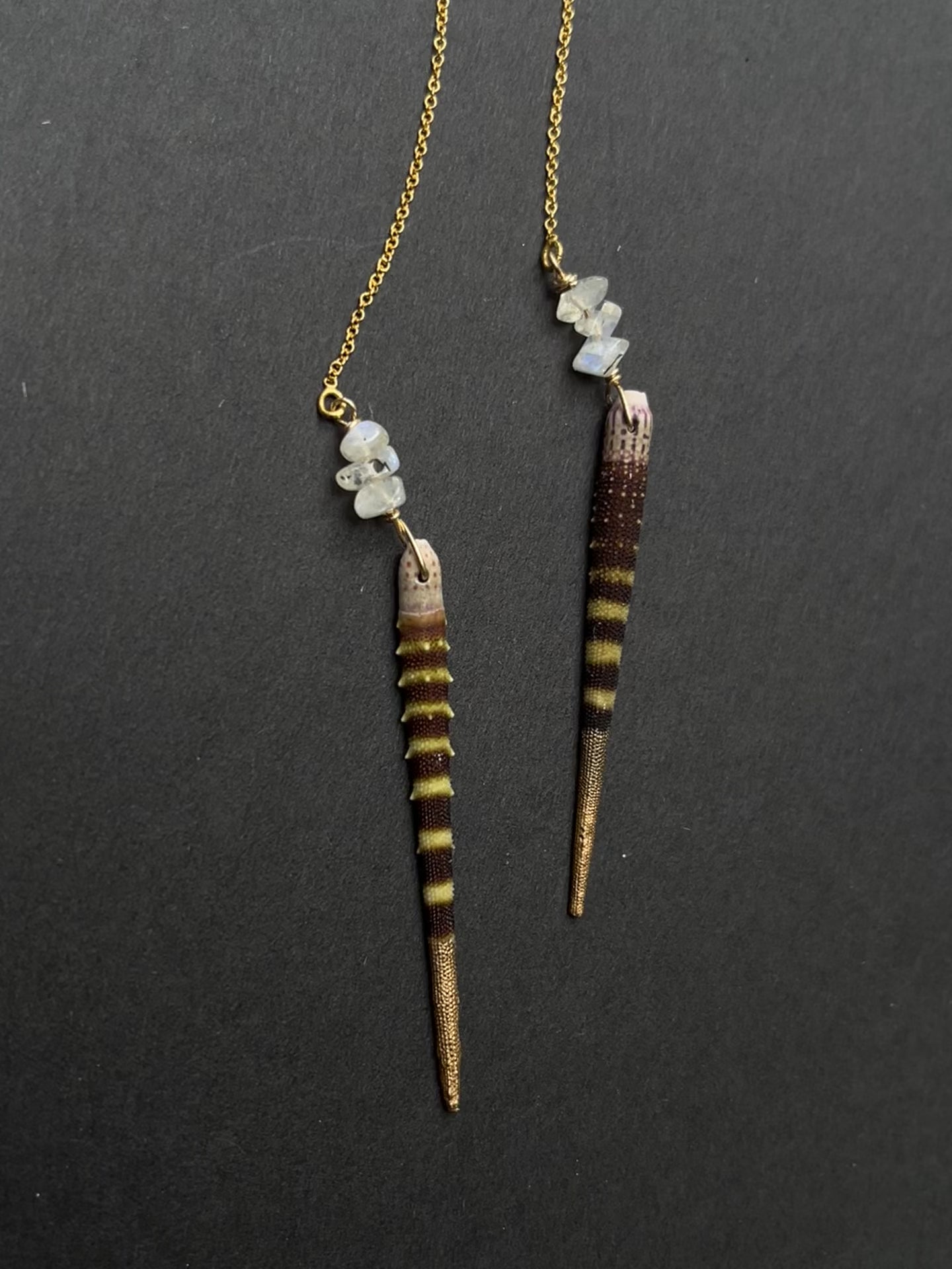 gold leaf’d tiger sea urchin spines paired with gorgeous rainbow moonstone on 14kt gold filled threaders