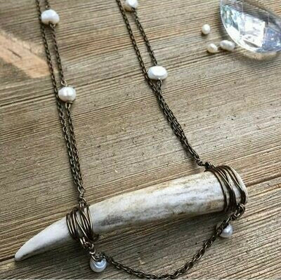 North American Whitetail Antler Shed Paired With FW Baroque Pearls woven onto Antique Brass Finished With a Soft Suede Deerskin Leather strap