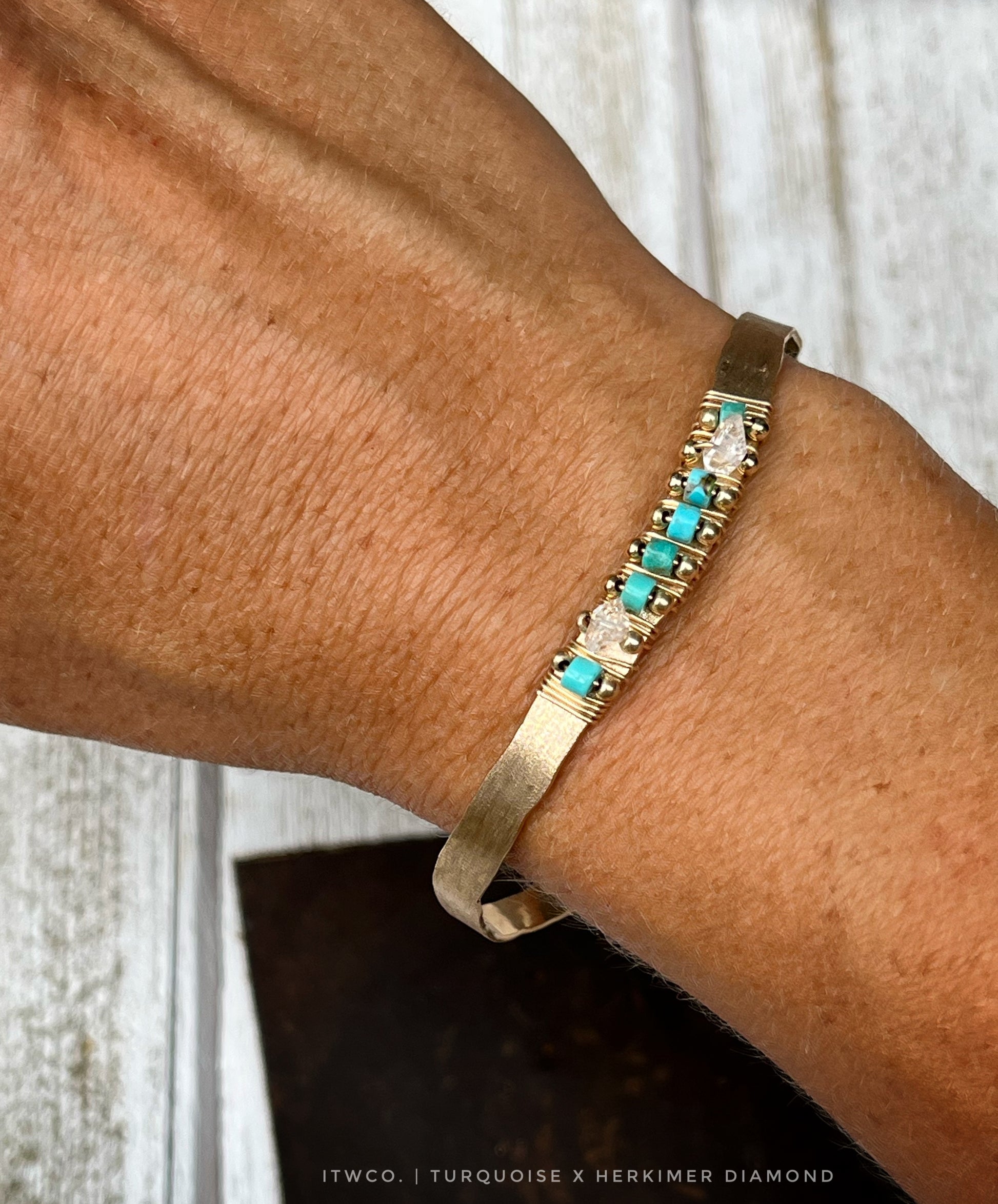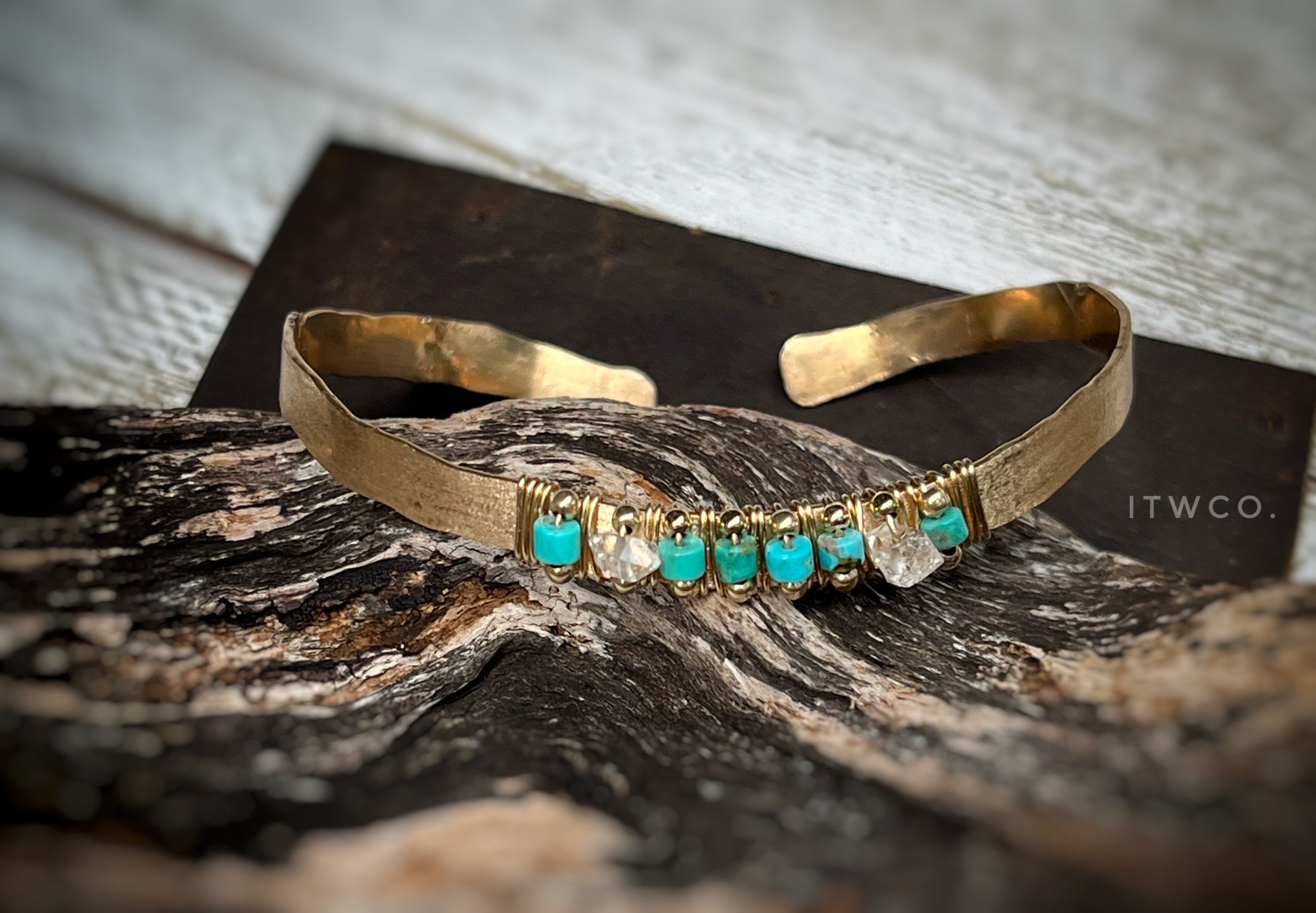 Hammered 14k gf 10ga cuff bracelet adorned with Herkimer diamonds x Arizona turquoise